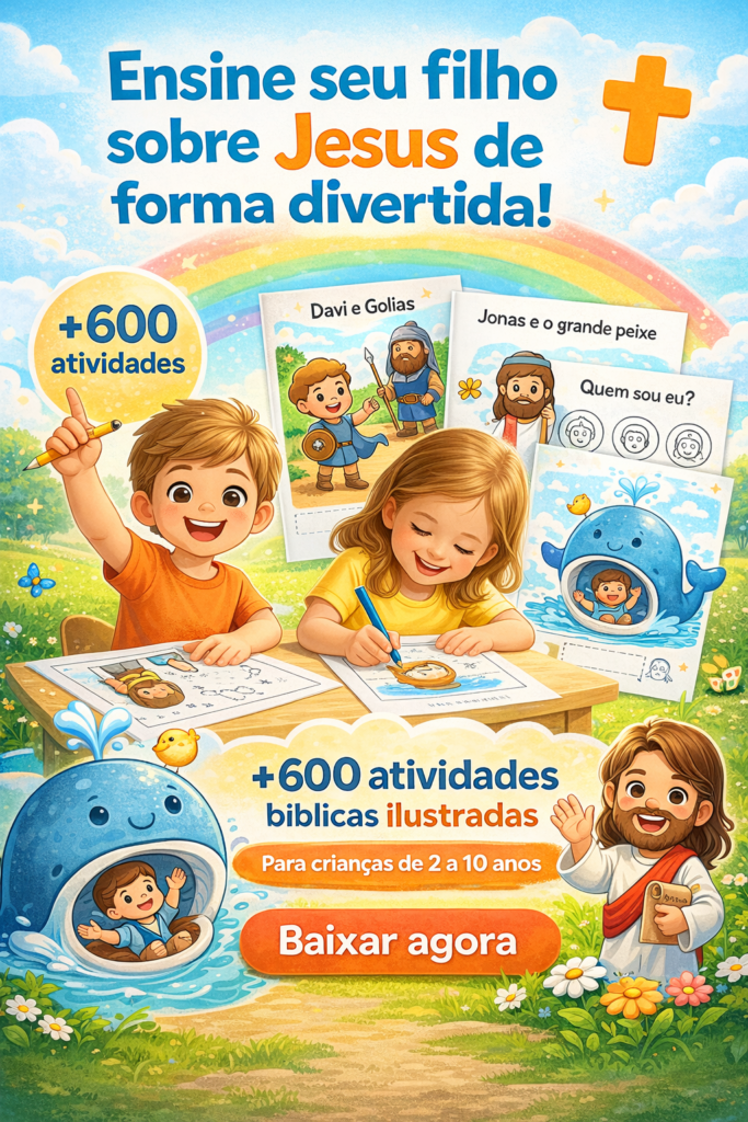 Você terá acesso a um material exclusivos feito por professores Cristãos para pais e outros professores! São mais de 400 atividades Bíblicas prontas para imprimir e utilizar com as crianças a partir dos 3 anos.